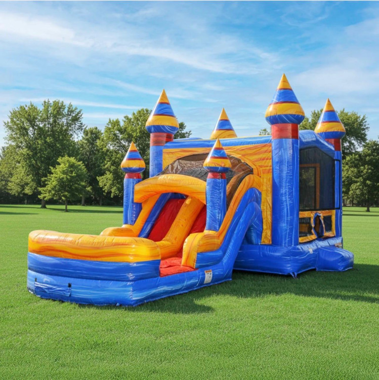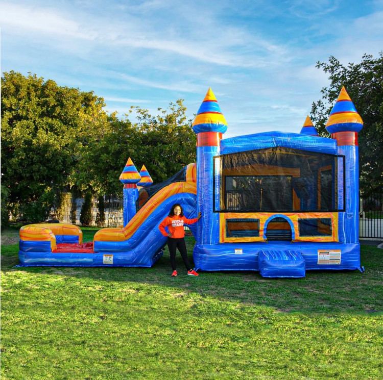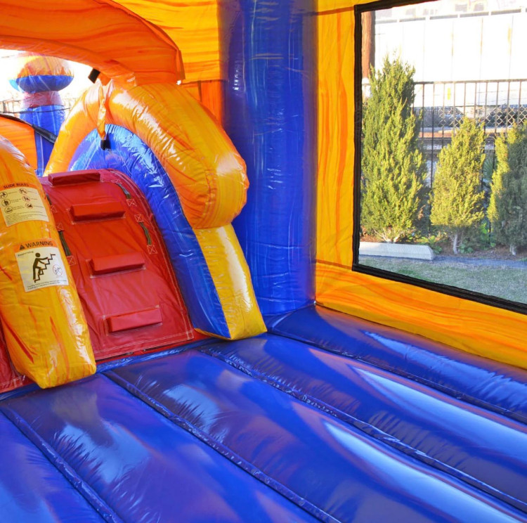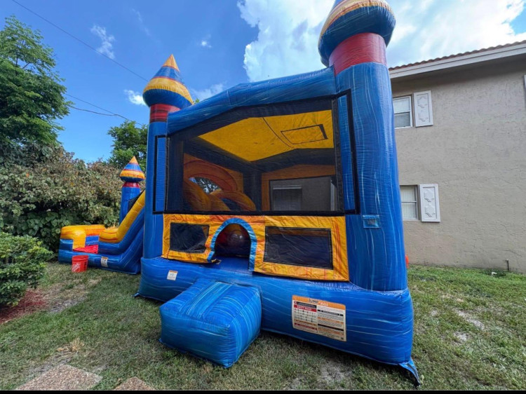 This unit is part of the X Series from JumpOrange, which features premium 15 oz PVC Vinyl, non-slippery stairs, extra vinyl at stress points, multiple deflation zippers and drains, and heat-sealed slide seams. This bounce house with a slide comes with an attached inflated splashing pool.