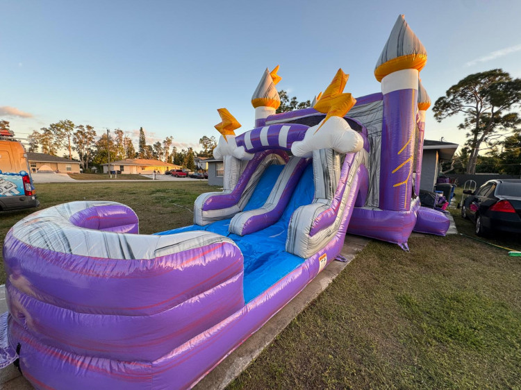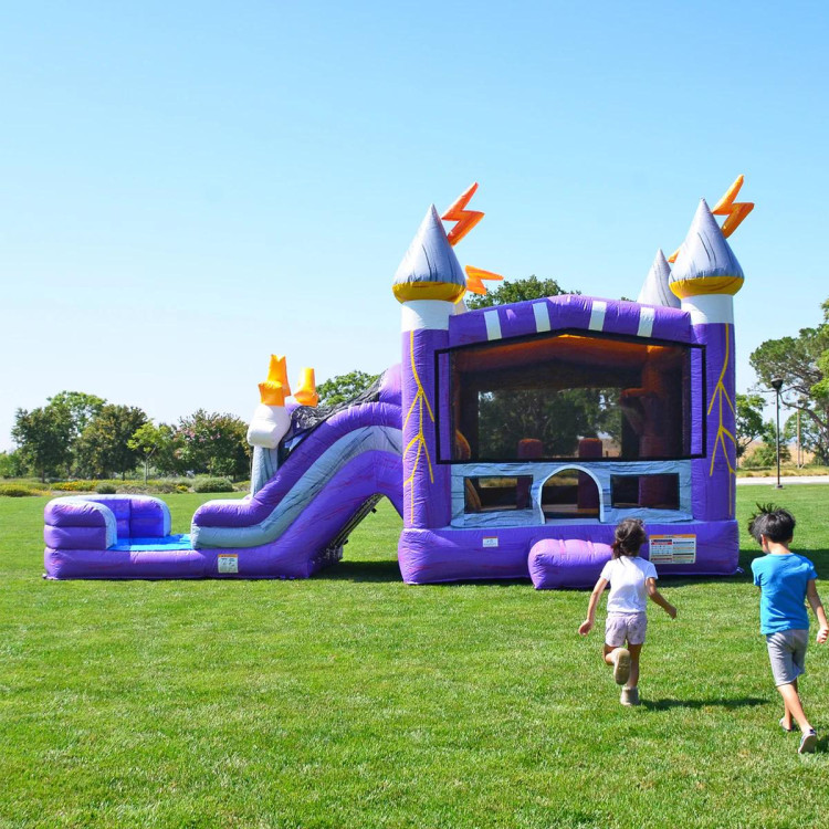 The Thunder Dual Lane Combo is a storm brewing with fun! Guests can enjoy a dual lane slide, bounce house, climb wall, basketball hoop, tunnel, and obstacles all on one inflatable! This array of features is a lightning rod for attention!